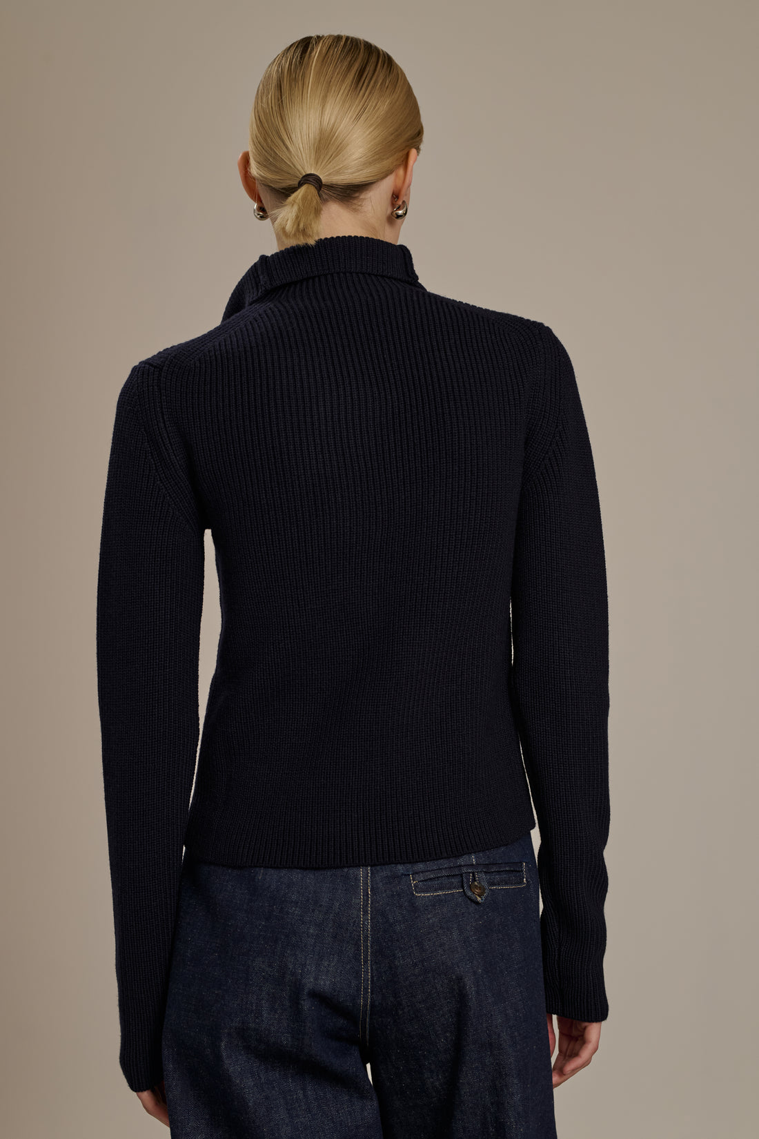 Our merino wool is knitted with Italian threads. It's insulating (keeps you warm) and doesn't itch. It's antistatic and maintains its shape without wrinkling. Here the knit is fine and ribbed, making the fabric stretchy and comfortable.
