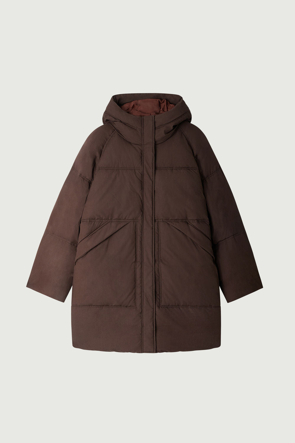 STORM is an oversized puffer jacket with a hood, perfect for winter. This long quilted coat features long raglan sleeves, providing comfort and warmth. The concealed button placket with zip ensures a sleek look, while its brown shade effortlessly complements any winter wardrobe.