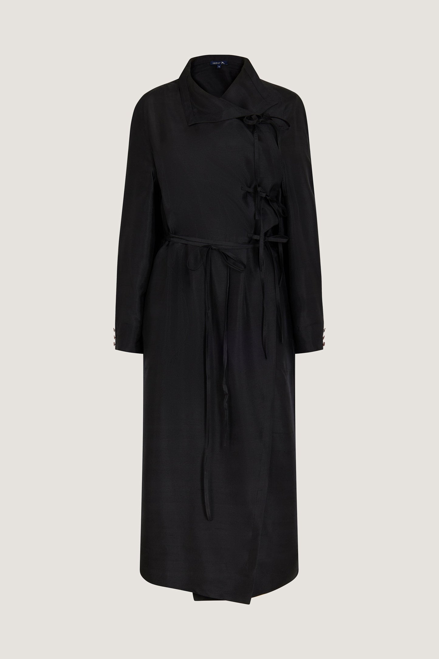 SUSIE is a dress with a couture look and refined construction. It's a wrap dress that closes right up to the collar with a set of ties at the waist and bust. The straight volume can be adjusted, tying and adapting to the body as required.