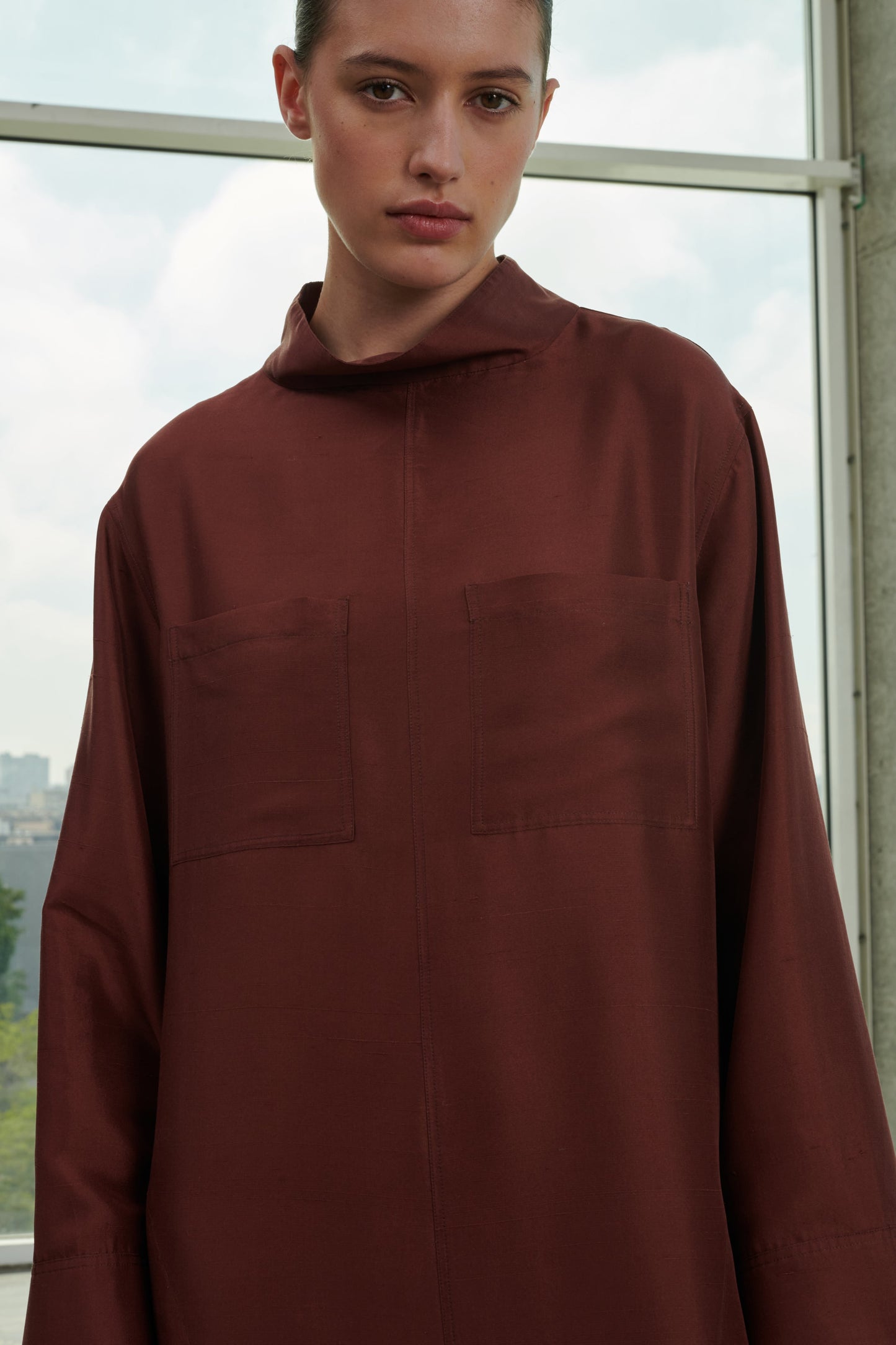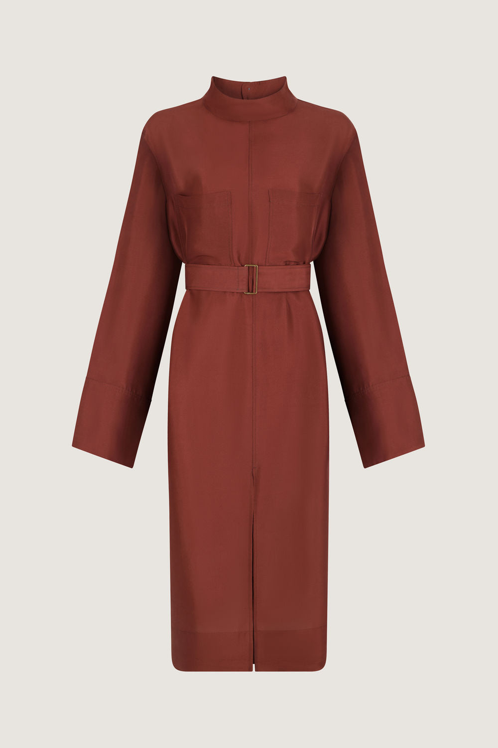 Dupioni silk dress with stand-up collar